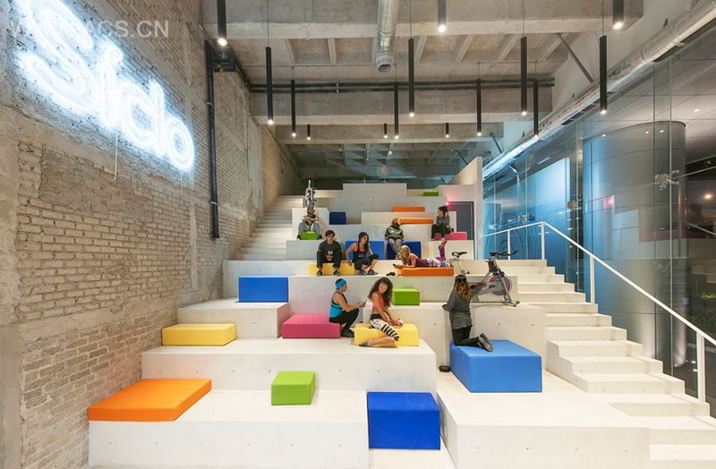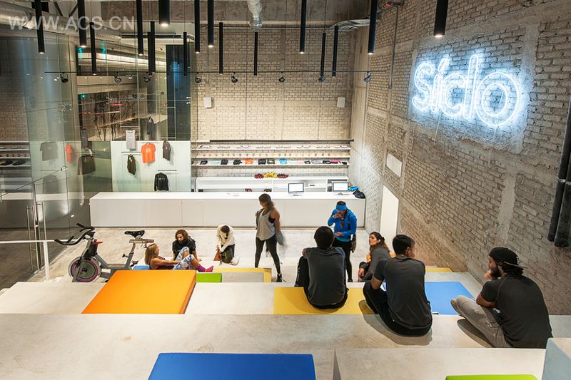 墨西哥城的siclo室内骑行概念店委任rojkind 建筑事务所的michel rojkind和cadena + asociados概念设计的ignacio cadena将他们充满活力的,有趣的健身理念投射到室内空间设计中去。透过一面完整的玻璃立面,一个密闭隔音的混凝土阶梯式体量构成了这个三层高空间的主体。从侧面进入,内部设有两间骑行课程专用的教室。同时,上面的空间充当“心灵与精神的空白画布”,那里的阶梯平台是休息、聊天、工作的好地方。由白色混凝土制成的多用楼梯上放有亮色的坐垫,增添了室内功能的更多可能性。