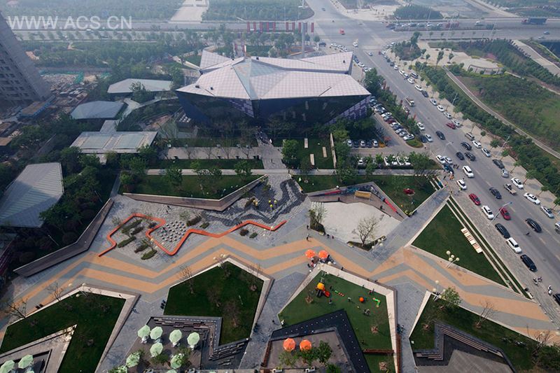 星光广场延续了万科城销售广场的景观语言,但星光广场承载了未来多期高密度住宅开发对活动空间和商业空间的需求。既要不对商业空间进行遮挡的同时,也要促进商业活动,并且让整个广场成为一个能留得住人的趣味空间。