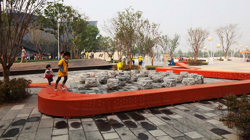 旱喷广场,喷雾石阵,奔跑的长凳,儿童攀岩墙,儿童下沉活动场,甚至轮滑广场,为各个年龄段的儿童/青少年提供了多样的program。每个program各自独立,互不干扰,观赏休憩区则鼓励家长们的交流和互动。星光大道把这些program一个一个串联起来,两侧的蒲公英灯和地面的灯互相辉映, 增加广场的趣味性,同时也把人们引向即将开业的商业斜街。