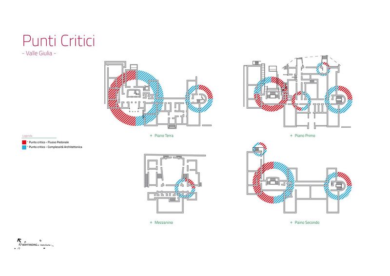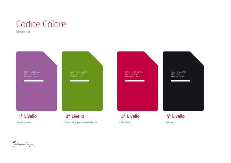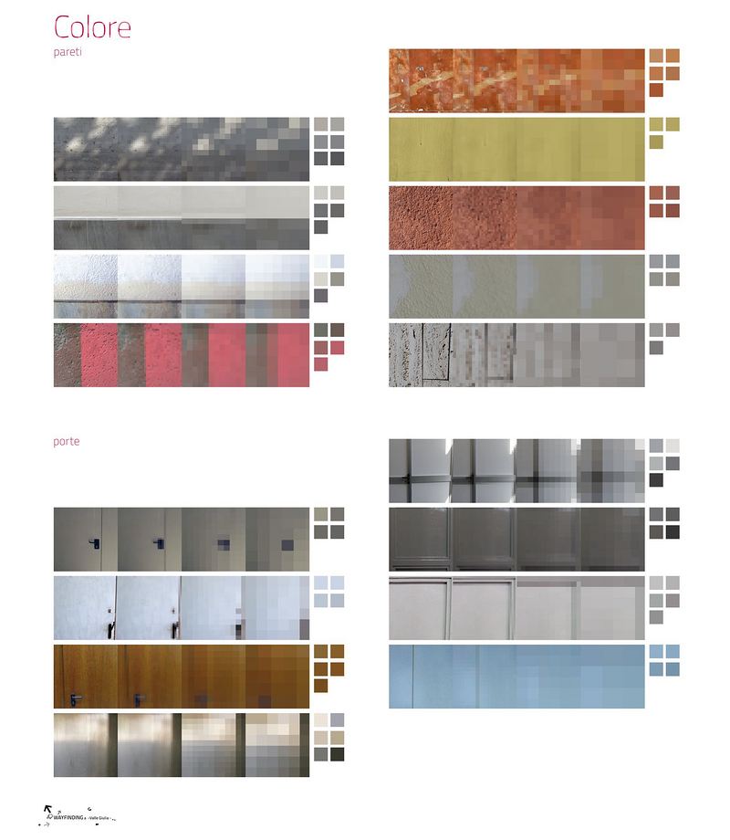 该导视系统为罗马大学第二建筑学院设计。由于80年代中期设计的旧的导视系统已不能再反映学院的要求,因此,新的导视系统应运而生。由于学生数量众多,加上教学科目的增加,以及为促进欧盟国家文化交流而产生的的交换生,意大利的大学经历了很多变化。该项目需要遵循特定的特征,除此之外,就是常规的导视系统的内容:标志、方向和信息。意味着可用性(双语意大利文/英文)和灵活性(办公室内部低成本更新)。一开始便将焦点集中在关键点检测(特别是有问题的建筑物路口)和现有的条件下有用的数据存储(建筑材料的类型、砖石的颜色、光照条件等...)。在规划过程中,需要特别注意层次、真正的系统框架。四个级别的信息层次结构(1°制度,2°大学服务,3°教学法的服务,4°基本服务)结合相关的颜色编码是为了更好地识别。资本系统部分使用乌尔比诺大学类型设计课程开发的一套免费字体——Titillium。信号大小的支持格栅基于字体。通过对字符最大高度细分(取决于可读性标准),我们获得一种在信号间适当运用检测空格的标准单元。该系统还提供了定制象形系统,基于艾加抗体同种型系统。最终,通过模板技术,标志被直接涂在建筑物墙壁上,以便获得所有的建筑物表面低成本的灵活系统。