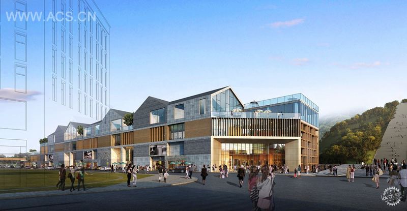 贯穿东西的人流,形成一条“脊”,并在室内空间形成贯通流动的开敞商业空间。外立面上形成通透的观景长廊,到达西端的玻璃咖啡厅,达到观景高潮,远眺群山,“脊”的下部为林次节比的商铺,每个商铺形成一个方形体块,错落有致聚合成为商业带的主体。“脊”的上部为相对放松布局的旗舰店,造型和空间体验与山西民居建筑异曲同工。