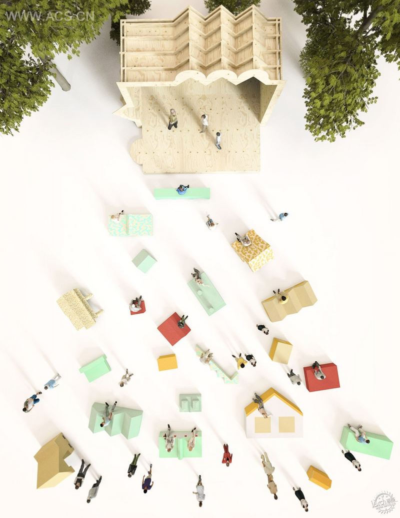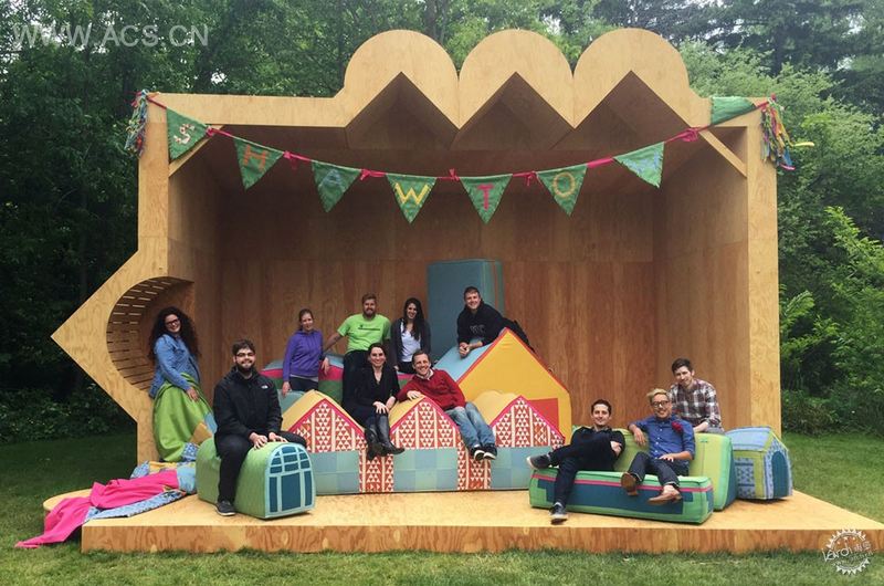 该项目由二十个靠垫和一个木盒子组成,该项目设计起到了双重目的,既容纳了这些靠垫,又用作户外表演的舞台。项目起名为Shaw Town,形式简单但融入了丰富含义,因为建筑的形状受肖所设计的建筑的抽象概念的启发。