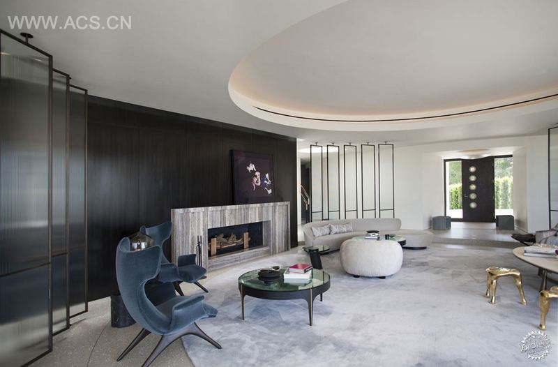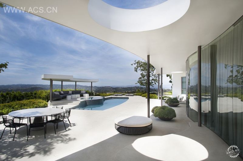 这个住宅位于一条尽头路的顶端,能大约270度角欣赏比弗利山和洛杉矶的壮丽景色。这栋房子最初设计于1962年。弧形和圆形的元素被重复使用,在最初的设计中随处可见。