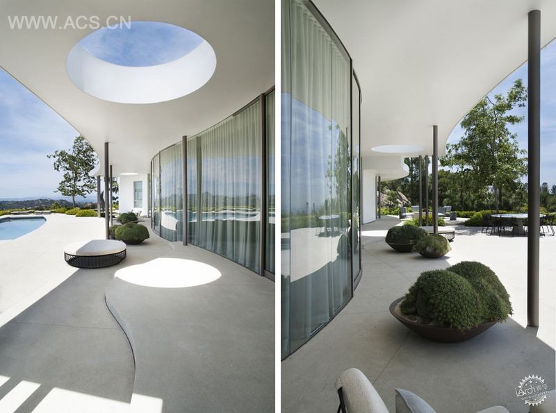 这栋五十年前相对朴素的住宅,现在享受着另一种生活。这是为善于处世的客户建造的当代洛杉矶住宅。除了前院,大部分外立面很简单,被粉刷成白色的曲面和长长的蜿蜒的映照着周边大范围景色的玻璃幕墙;某种意义上房子是通向风景的门户。