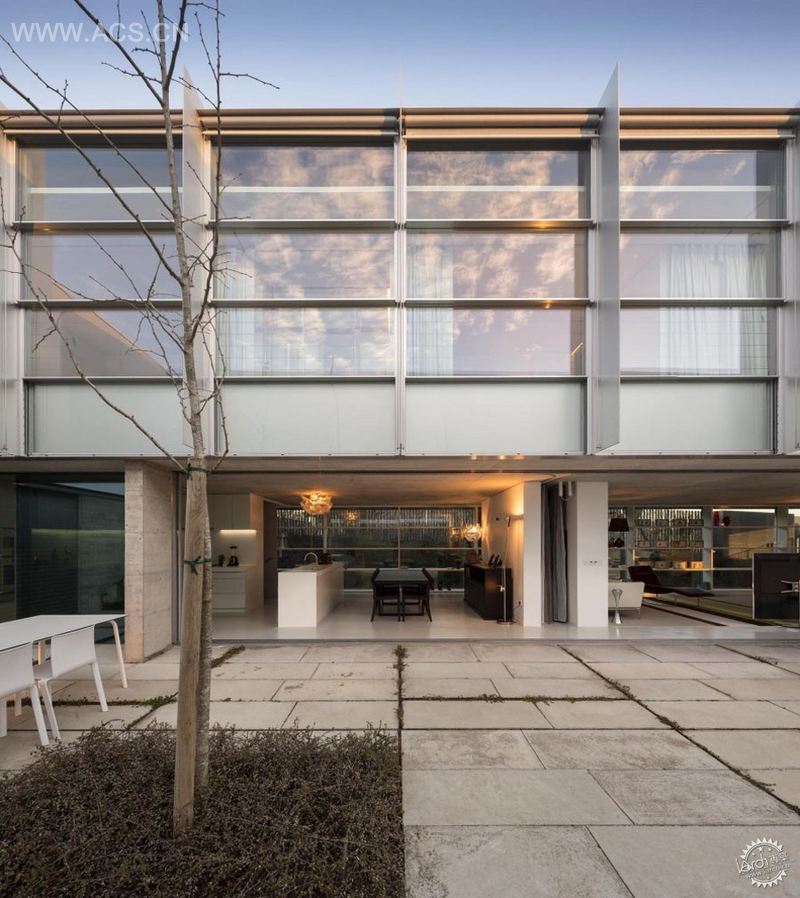 外部是阳极氧化膜和抛光铝,能够反射天空和植被的颜色,包括树下的影子 — — 相对半透明轻柔的内部。"日间"区、房间和厨房位于一层,与大院直通。由于环形结构围绕房子的上层,利用地点的横向维度和水平透明性,下层的房间可以享受两重阳光。