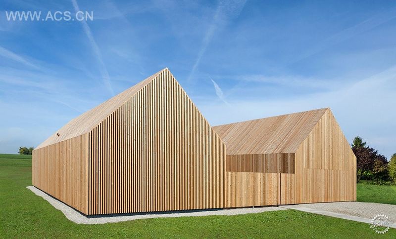 该建筑的两个三角墙结构用木质薄板统一起来:一个包含生活空间,另一个包含一系列卧室。
