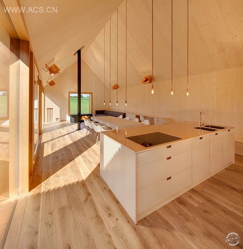 在屋内,木料继续用在很多地方,如外露的结构框架、木地板,还有木桌、橱柜和外表。