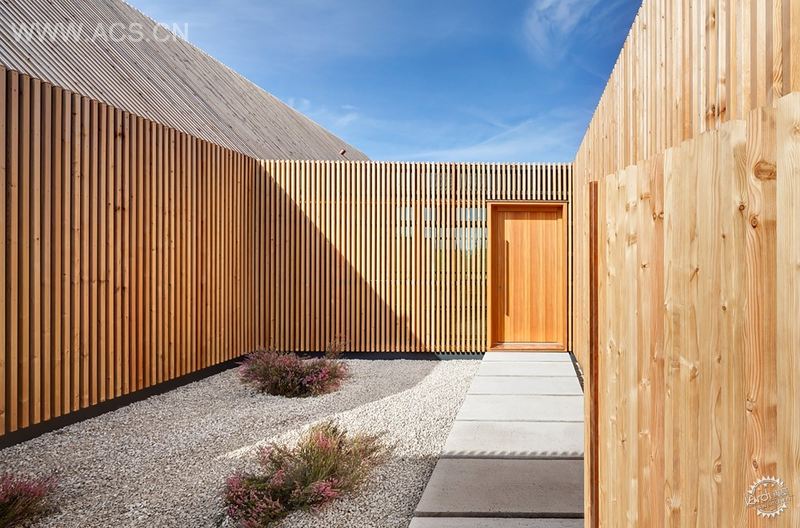 临街一侧的窗户用木薄板屏蔽起来,同时朝向风景一侧的窗户有着无限制的视野,能看到外面的景观。立面采用未经处理的松木,因此随着时间推移将变成灰白色。从远处看去,房屋看起来像是两个完全相同的体量并排而立,而且完全没有窗户似的。