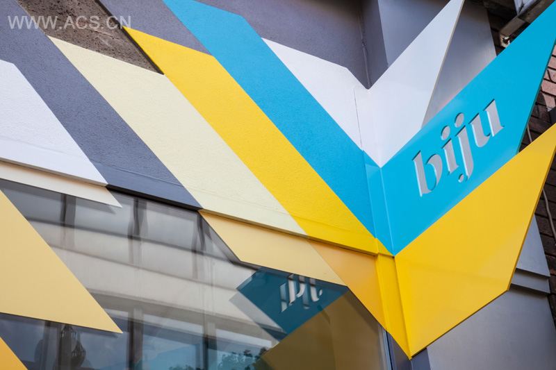 The use of natural cork in the interior refers to Biju’s use of only fresh natural ingredients, whilst the fun aspect of the drinks is reflected by the vibrant colours, neon lighting and op-art graphics.