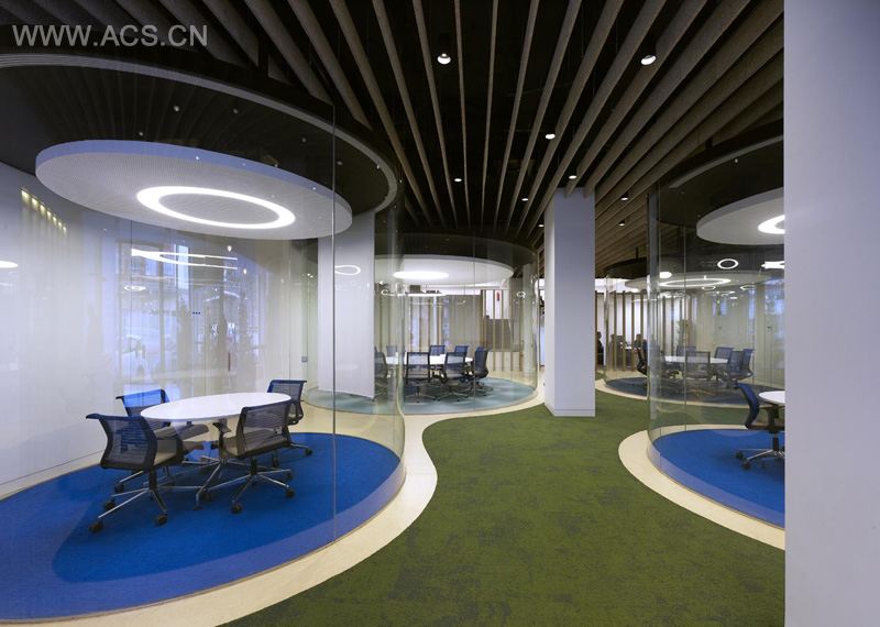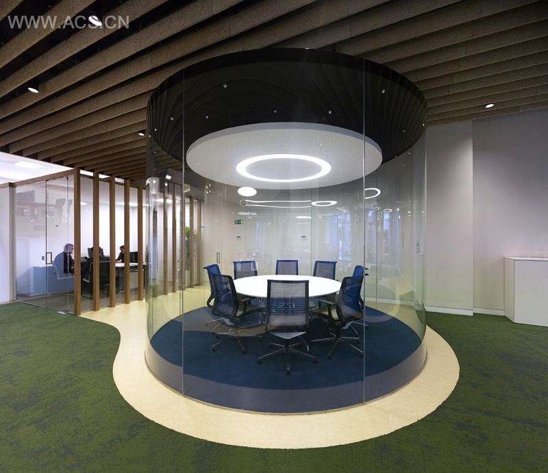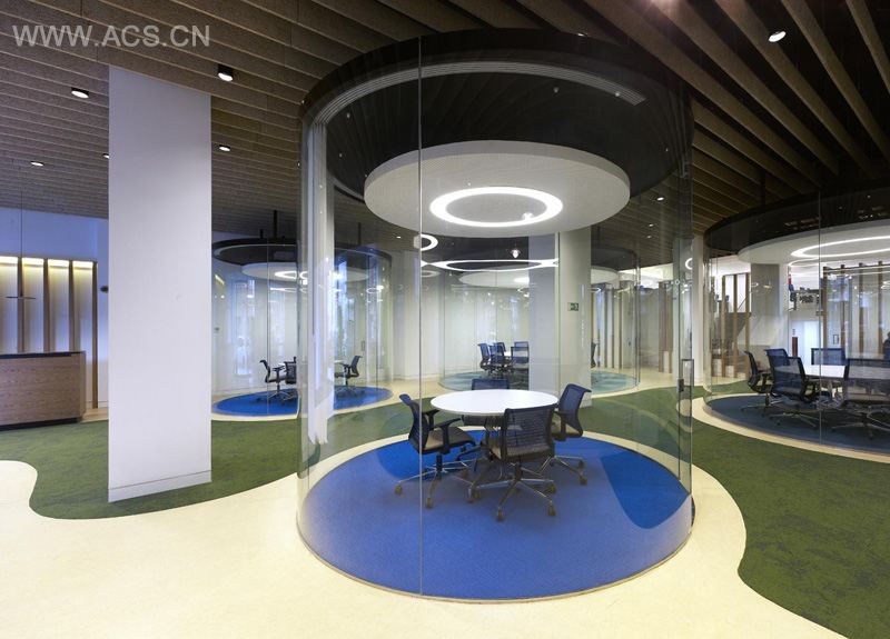 For the AEGON office in Madrid, Spain, MVN Architects designed a series of transparent glass cylinders, to provide meeting rooms that offer acoustic privacy from the rest of the office.