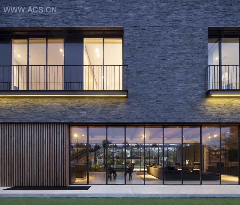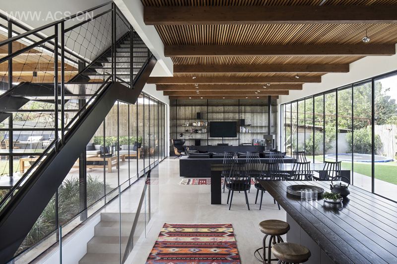 A long pathway, made of uncut basalt slabs, leads from the southern side of the lot to the main entrance. Ground floor, comprising a kitchen, service room, pantry, guest rest rooms, a dining area and living room, is open on both ends, expands and opens the space and creates an unobstructed view of both sides of the lawn.