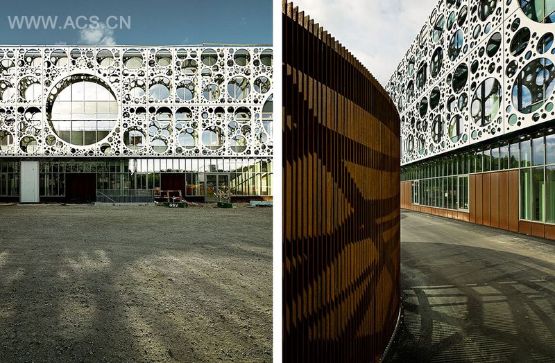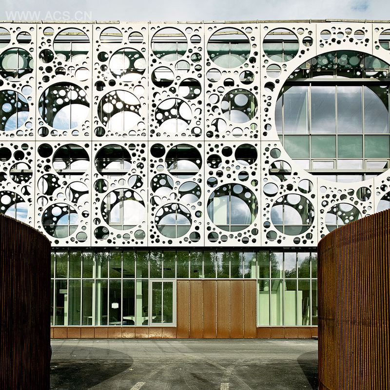 屏幕正面是由仅七种不同类型的混凝土面板合成,板穿孔模式的不同直径和布局已得到优化来充当太阳能和眩光保护屏幕,降低高达50%的太阳直射,却并不影响所有通往绿色环境的室内通畅视觉景象。