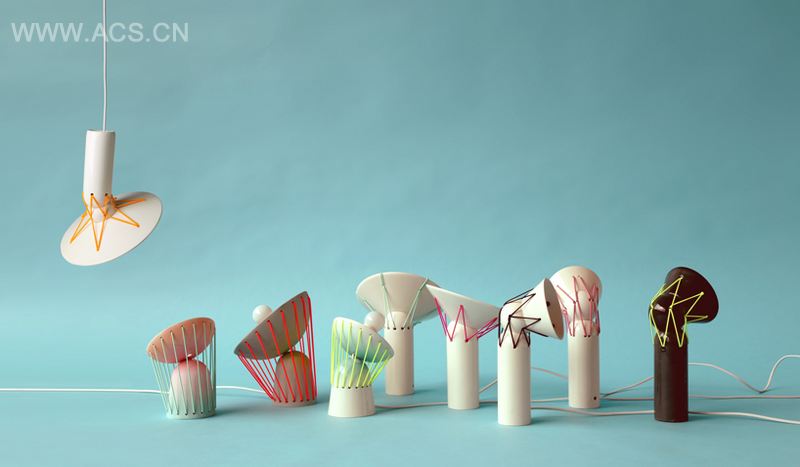 “弹性灯”是用多个光滑陶瓷碎片和橡皮筋制作而成。橡皮筋可以帮助人们按照所需调整灯的方向。简单的几何组件和亮色皮筋构成的可旋转结构,既充满乐趣也很有魅力,给所熟悉工艺的人们带来一种全新的体验。