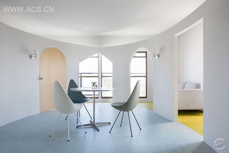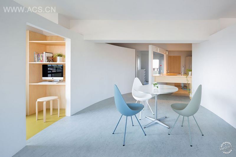 在改造过程中,第一步是除了浴室外,移除大多数现有的分区,创建一个大空间。下一部是插入三面稍微有弧度的墙壁,它们不是从地板到天花板,与天花板有20厘米的间隙。
