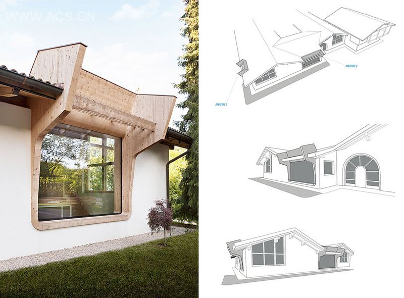 建筑事务所MESSNER ARCHITECTS在意大利北部高寒地区Renon为雕塑家和画家弗朗茨·梅斯纳尔( franz messner)设计了全新的工作室。建筑师主要改造了门面,并在艺术家工作室的西面和南面设置了两个大窗户,窗框造型独特,成为别致的捕光器,改善了艺术家工作室的采光。整个工作室分为三个不同的区域---两个独立的工作区位于端头,而中间是一个共享的储存空间,该空间双层高,为阁楼,每个工作空间都有楼梯通往该阁楼。