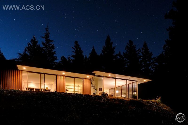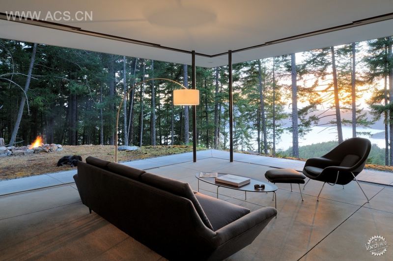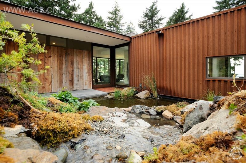 在外观设计上运用了一些她最喜欢的材料:从华盛顿东部的仓库回收的百年前的旧木料,生锈的钢料做壁板以及从基地周围采集到的苔藓和岩石等。巨大的滑动玻璃门打通了室内外之间的联系,起居室置于树林之间,让业主更好地享受室外优美的风景。入户花园将别墅间分为两部分,把风景带入室内的同时也能让人在室内好好欣赏室外的美景。The 800 s.f.美术工作室和储物空间被生生隔开,方便日后将它们转变成附加的卧室。