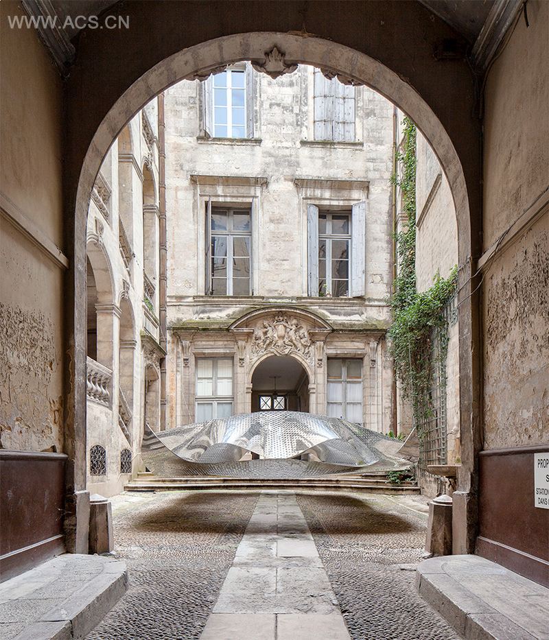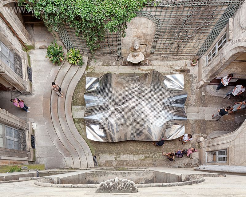 2015年的 lively architecture festival建筑节上,FAKT团队制作了一个铝合金云景,放在蒙彼利埃的一处省级庭院内,该装置看上去很轻,像漂浮在庭院里一样。这个来自柏林和苏黎世的团队把“#034”想象成一个空间和结构试验-两块2mm厚的铝合金板在半户外的空间内此起彼伏,占据了6.4米长和4.5米宽的空间。这两块纸一样的铝板巧妙地弯曲形成褶皱,相互连接在一起,形成了许多孔洞,透过这些孔洞,游客们可以从装置的一头看到院子的另一头。