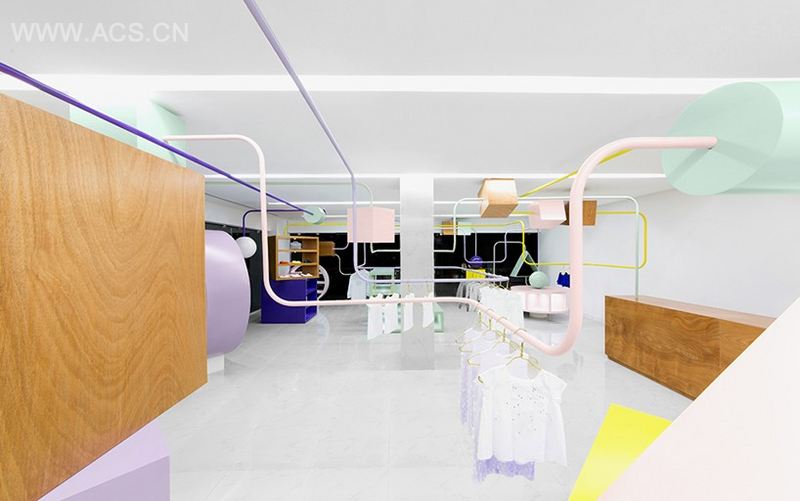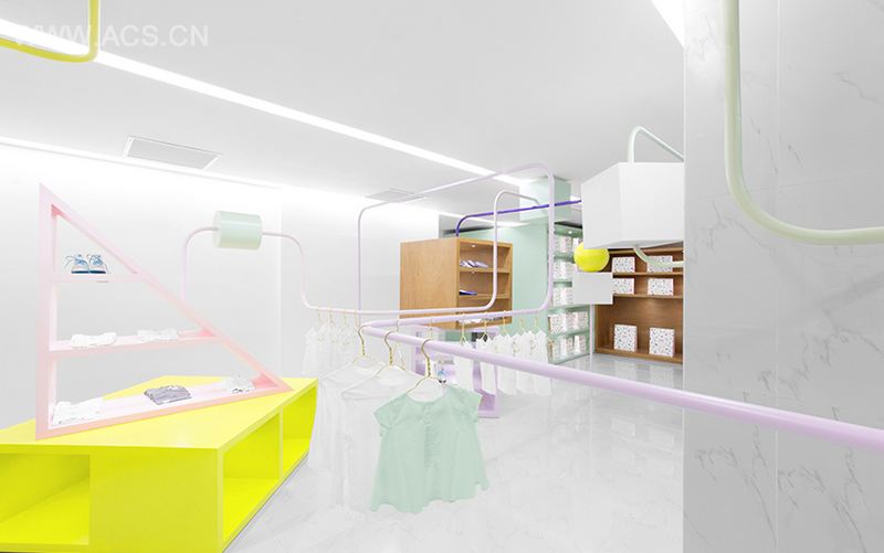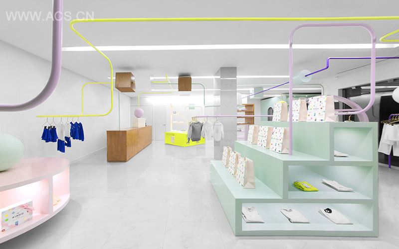鲜亮的粉彩色与霓虹色反映了儿童的个人性格,管道被当做挂衣服的栏杆使用,与此同时粉彩的“珠子”展示了各式各样的配件。此外,设计者还补充设计了极具魅力的室内装饰 ,并配套设计有购物袋、包装纸、目录簿,以此促进风格的统一和独特的图形标志。