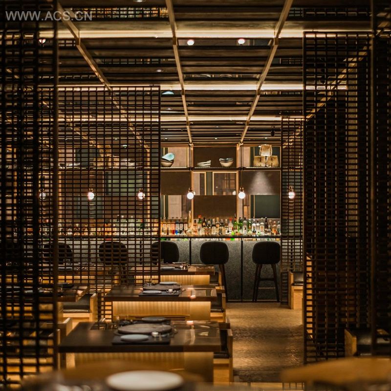CHI-Q是名厨jean-georges vongerichten在上海新开张的一家高档韩式餐厅。该餐厅位于历史街区外滩三号,由当地如恩设计研究室(Neri&Hu)完成室内设计。方案具有一种抽象的气质,融入了许多在传统韩式家庭中经常能见到的装饰元素。木炭、混凝土以及木材塑造了空间的质感和一种原生态的质朴。在入口处,食客们被自然而然的引向窗户旁边的长条形酒吧中,窗子外边正对着一座抬起的花园。同时,餐厅的中心位置处是饶有趣味的四层通高的中庭,中间放有一张长方形宴会桌,桌子上方悬挂着灯泡。中庭每边的墙壁上都有整齐排列的木条做装饰,它们以独特的方式组合在一起形成了一种奇妙的光影效果,仿佛森林的树冠。