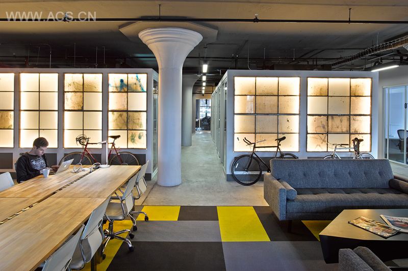 The old exterior factory windows that were replaced, were re-purposed to create dividing walls and become interior light sources in the main open desk & conference room area.