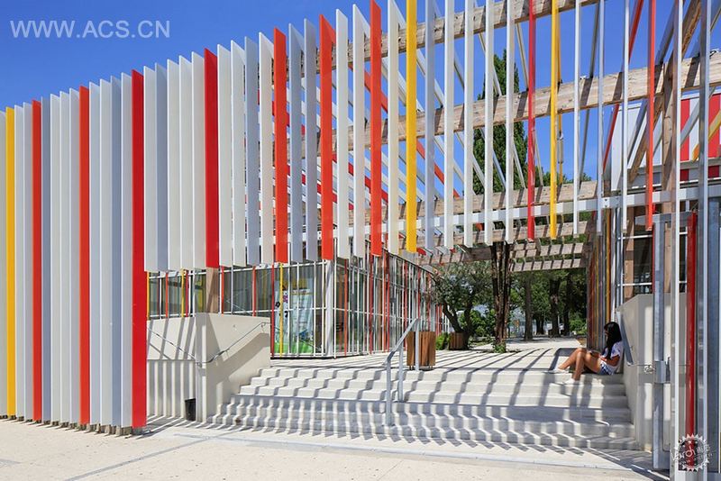 该项目面临的挑战之一就是给该建筑建立一种类似于过滤器功能的设施。高高的垂直面上安装着彩色条板,打破了空间,产生一系列明暗交替的变化。该装置的透明度设置的恰到好处,使得什么是隐藏的,什么是被看到的变得可能,从而打破空间,为行走在里面的人提供一种多层次空间。