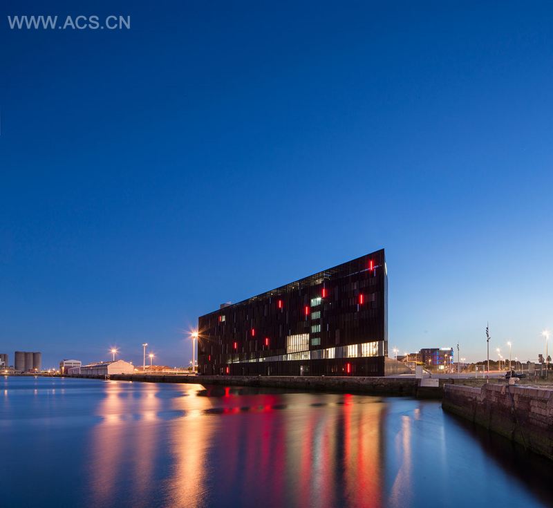 在这个航海如此重要的城市码头上,有一座法国建筑事务所AIA设计的船舶学校,学校位于天空和大地之间,深色的铝板让建筑那清丽的身影更加明晰,建筑底部有一抹透明大玻璃材质,到了夜晚,如同灯笼般发出光亮。