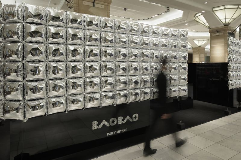 游击店的空间设置了一个由氢气球连接而成的巨大立方体装置。银灰色的装置在这座极具历史意义而又十分庄严的百货商场里显得有些奇怪。除了让人无法错过的反光表面,每个气球还会因空调或是经过的路人而带来的气流而不断振动。之所以选择这样的设计是因为其亮度以及几何学特质,完全就是新产品的化身。该游击店中一共有300个气球。