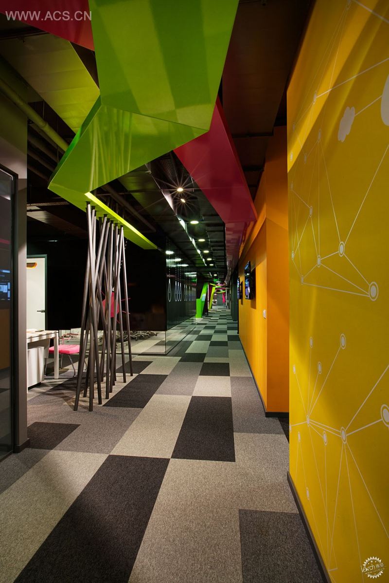 为了实现这个目标,我们在整个办公空间环绕了类似缎带的装饰,并且使用代表企业风格的颜色。这些丝带装饰之间有的交叉在一起,有的分开,有时降低,有时升高,时窄时宽……最后,我们就设计完成了一个灵动、变幻、浮雕般的功能结构,该结构还包含了所需的空间和组件。我们喜欢将这个结构简称为“缎带”。