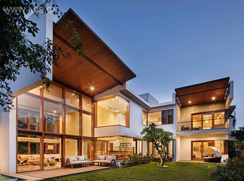 The surfaces of the facade are a mix of white stucco and polished cement juxtaposed with timber cladding on the underside of the roofs. Flooring are large swathes of polished Indian Grey Kota stone.