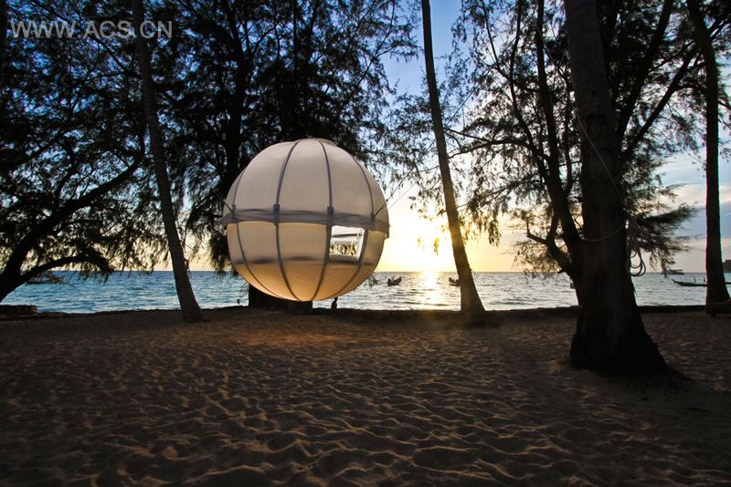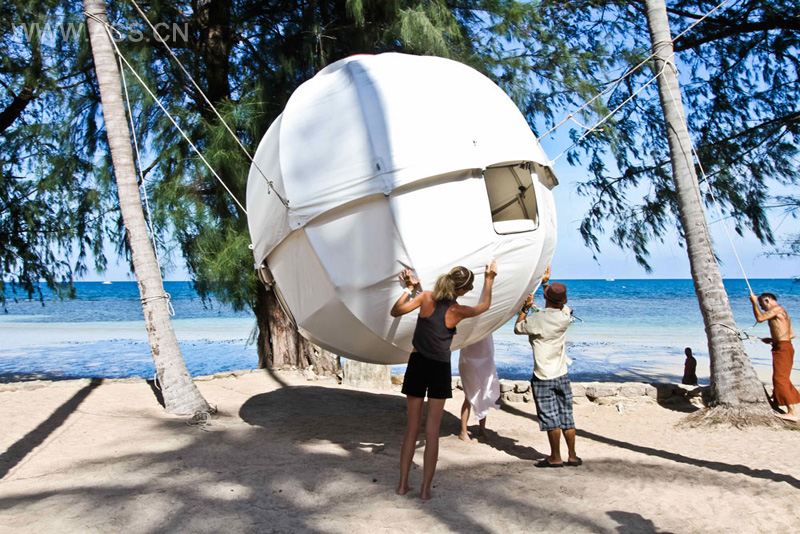 The Cocoon Tree is a spherical structure that can be suspended from trees, allowing you to hang above the ground in a pod.