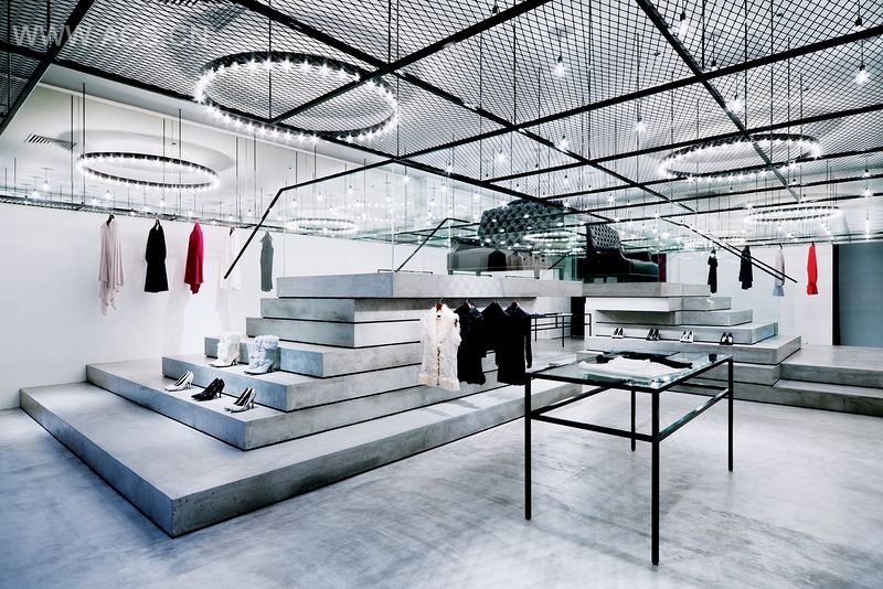 如何在室内将3.65米高的天花板合理化是设计师面临的最初挑战。一般来说,就单个精品店而言,在视野以上的空间,因为大部分的买卖行为都围绕着身体接触展开,所以其功能性非常弱。为了避免这一空置,设计师在2.25米高处架构起假的金属天花板,并且设置了阶梯平台,方便顾客走上阁楼。