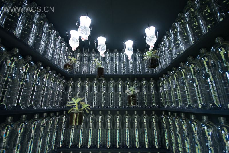 该装置是一个小屋的形状,墙体由480个透明的塑料瓶组成,外面盖着一层遮光布,室内所有的光源来自于5个悬挂在顶端的小“太阳”。这是5个和墙体一样的塑料瓶子,头朝下悬挂在顶端,一半在外面,一半在里面,每个瓶子里都装满了水,每个瓶子下面用尼龙绳吊着一个小玻璃容器,里面种着一株正在发芽的植物。