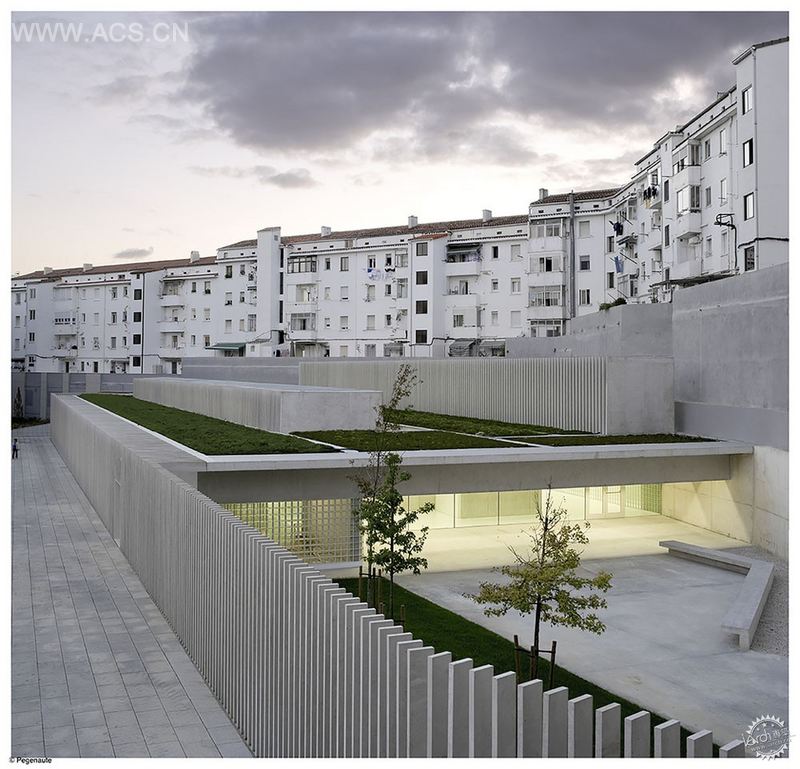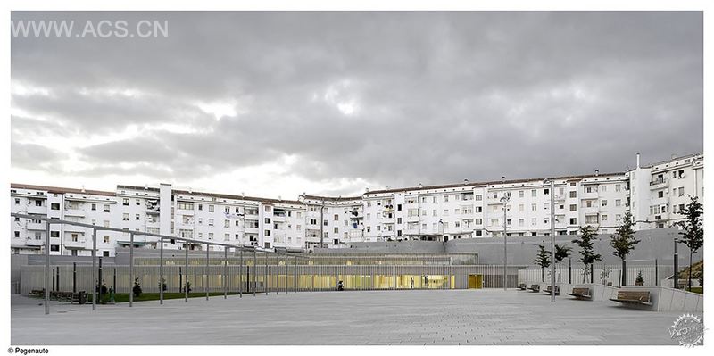 潘普洛纳的幼儿园项目主要受限于场地价值,否则将难以了解本项目的设计思路。场地为回迁项目,位于潘普诺纳的城市边沿。场地几乎是三角形,其中两边分别以一道隔墙与后方的一排建筑隔开。剩下位于南面的一边长度最长,向入口广场开放。