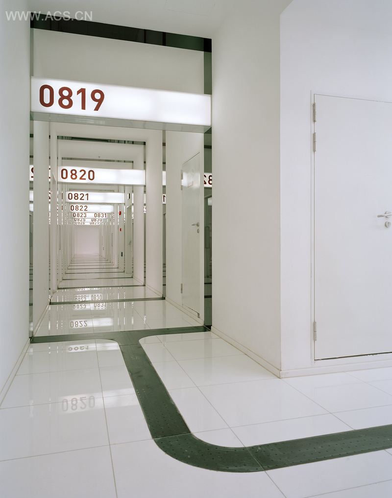 例如,代表商业区的一楼主要采用了金色标识,还有部分空间采用了其他两种颜色的标识,这就象征着三种不同类型的人群在这层楼汇集。另一方面,通向办公室的门厅采用了银色标识来强调商业区,它指引着参观者进入建筑之中。