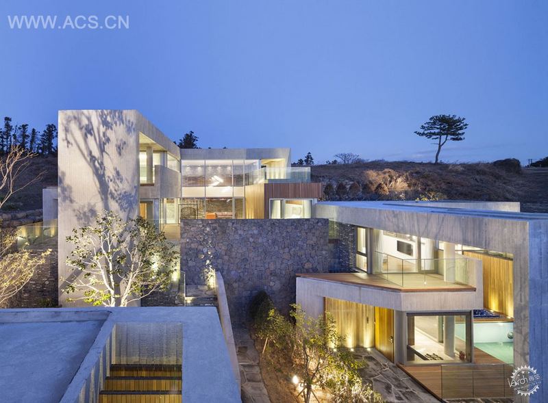 仿古砖、石丘、济州石板是一种天然材料,经由手工精制而成,它成为一种人类活动的过程,自然过渡调整和沟通其粗糙的性质,它也成为一个框架,创造了一个适合人类居住的空间,通过创建标准和作为地层的边界,连接到地面。通过使用玻璃和镜子对景观的反射,再现自然风光带来的惊喜,人们可以体验超现实的空间,给济州岛创造一个休憩之地之余还可以补充能量。