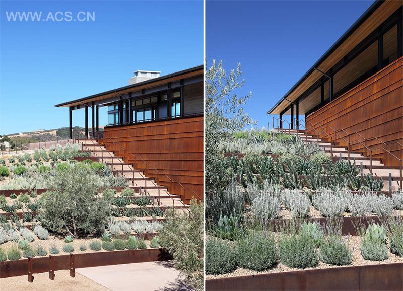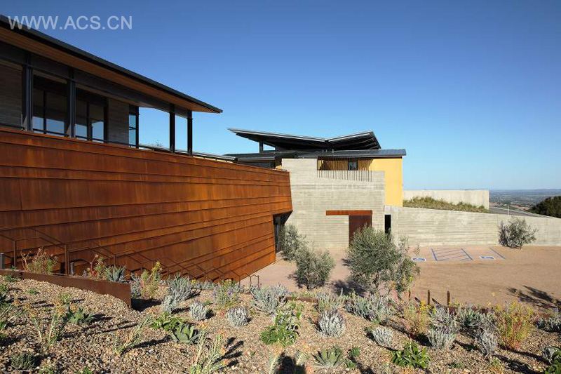 Sustainable design elements include rainwater harvesting, natural daylighting, roof photovoltaic panel set-up, green roof, xeriscape landscaping, night-cooling of fermentation and barrel storage, and minimized non-permeable paving.