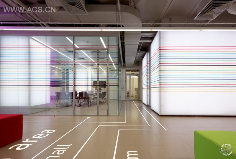 颜色。从每个控股公司的品牌标志中挑选出来,确定了集团的品牌颜色。品牌颜色被升华成的线,缠绕整个区域,改变表面的材料,由此形成在一个空间内,在意识形态上团结所有阳狮集团的品牌。