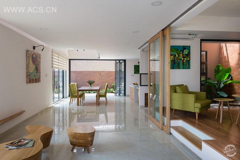 一个包含许多功能区的住宅需要进行灵活的设计。因此该空间是经过仔细考虑设计的室内庭院模式,就像是整座建筑的心脏,被自然元素划分成不同的功能区。此外,该住宅还巧妙地将阳光和雨水引入这个室内庭院,看上去相当有趣。这样的设计真的是很吸引人,在这里,人们可以忘我工作,听音乐,烹饪,接待朋友和举办派对。