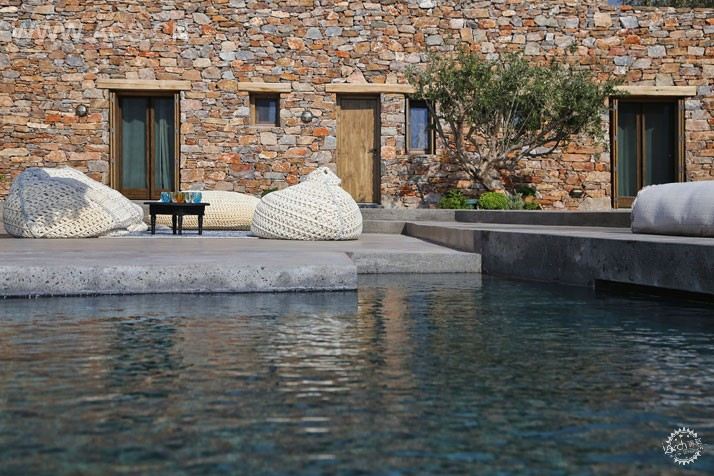 更为特别的是,人们能从房子的背后通过一系列种着当地草本植物的庭院进入到锡罗斯1号。围绕着住宅的中间有起居室、厨房,厨房连着主卧和对于朋友以及其他家人来说很理想的两个次卧。另外两个客房挨着正房,不仅有着自己的私密空间,也能比较容易地到达公共空间和水池。同样的,锡罗斯2号也由一个可以入住4人家庭的正房和房后面一个拥有两张床的客房以及一个共用的厨房组成。最后,能够欣赏到绝佳风景的地方便是那两个将爱琴海风光尽收眼底的游泳池。