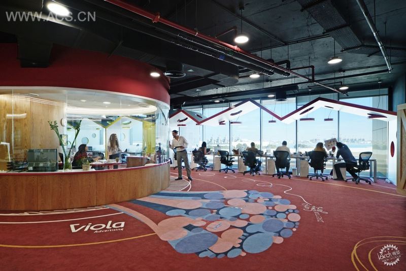 工作区有极富创意的时髦外观,还有某些对阿布扎比来说独特的东西。主办公室是一个开放空间,Viola 公司所有部门在这里一起工作。这个分区成功使用了“圆柱”和“箱子”。圆柱是个开放的圆荚体,包含有创意的主管办公室,他们拥有自己的空间同时和团队直接联系。箱子包括封闭的办公室、录音室和会议室,完全和主要开放空间隔开。所有团队很容易互相交流和并肩工作,同时保持他们的个人环境。每个部门用不同颜色来标识,地毯的定制设计也作相应的改变。