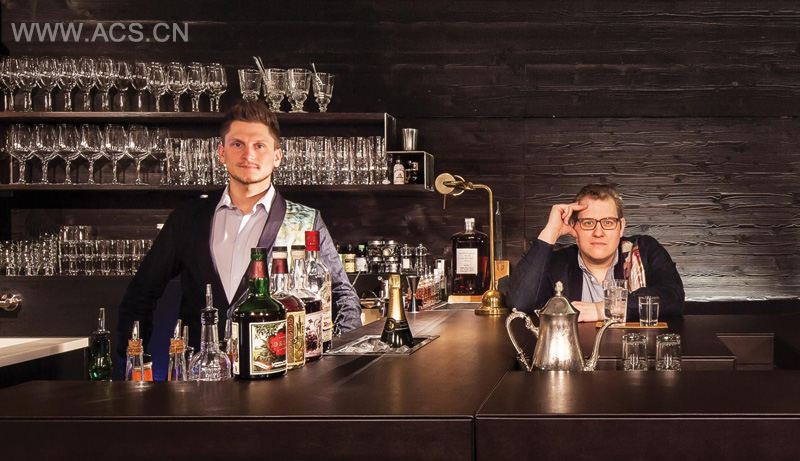 Behind the counter, everything necessary to serve demanding cocktail guests is rigged up around the barkeeper.