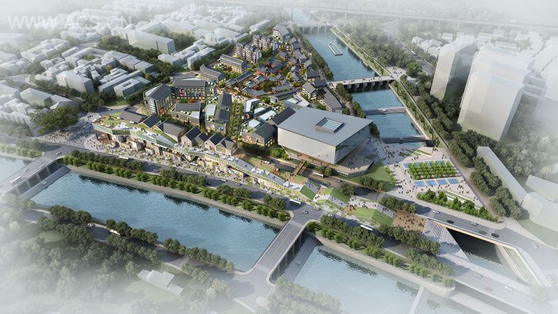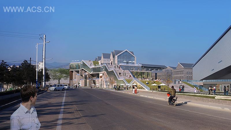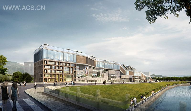 项目用地在东西向有250米长,但是在宽度上仅有30米,这是由场地四周原有的车行交通道路所限制。KUAN建筑事务所所主持设计的这个项目受到地块奇怪形状的影响,决定在地块的长方向上建造一条专门的购物街,并努力将其塑造成巨大的“远古鱼”的形状,是为了呼应周边景观和场地内大量的中国传统艺术。