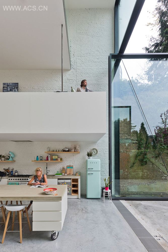 一间在小镇上准备好了迎接下个世纪的房子。建筑立面保持了其历史功能和资产阶级形象,线条整齐。与后面产生了充分的对比。所有不适宜的加建都被一个由空间和光线组成的单元取代。太阳光和花园北引入建筑中来。后方简洁而又现代的玻璃有着世界上最大的旋转窗门——三米宽六米高——使房子准备好了迎接未来。
