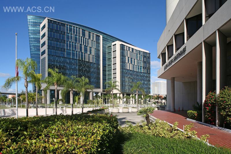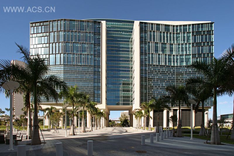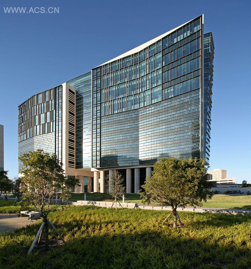 这座建筑有三个元素构成:两座相互对立的塔和他们之间的一座“水晶”玻璃。每一个上层楼面都有四个法庭,聚拢在被一个锥形中庭贯穿的中央流通空间。该建筑的正面由被预制的石框环绕着的交替式凹凸的“海湾”护墙窗户组成。那水平的和垂直的遮阳棚的交替节奏、深度和颜色框住了蓝绿色的套色玻璃。建设北面和南面的原材料和护墙一样用预制石;为其高度提供了可靠保障。宏伟的窗户水平和垂直地排列着,每一个方向和开窗方式都是独一无二的,映射出办公和法庭功能性的层级差异。这种建筑风格是为了体现内部重要性,这种重要性也使得这座建筑成为不管是白天还是黑夜都能辨认得出来的符号。