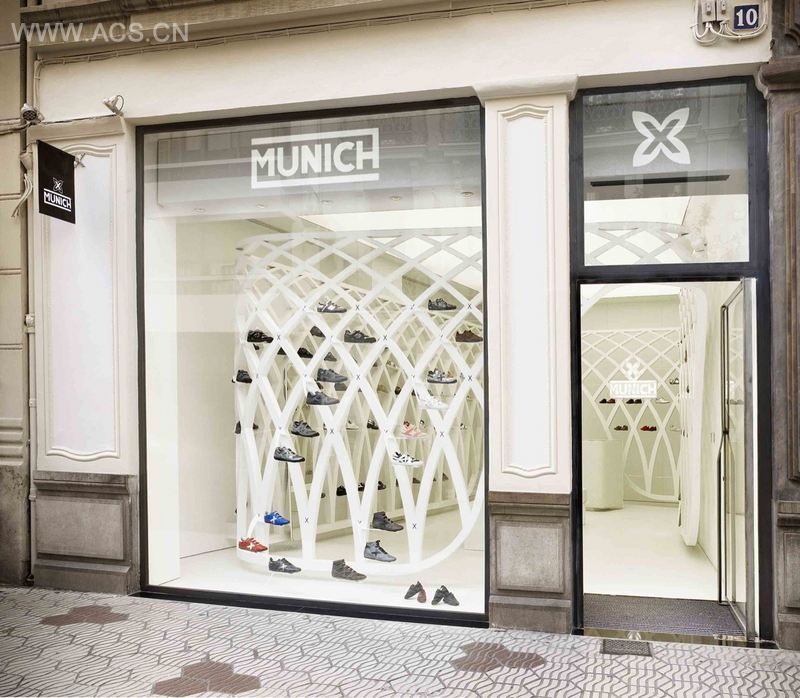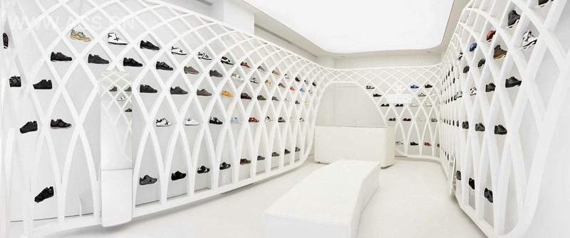 巴塞罗那的Dear Design设计工作室带来关于体育场的灵感——为了让游客在店面中体验一种运动的感受,结合平日生活中最为熟悉的运动场拦网元素,用金属晶格的方式去展示这些鞋子。