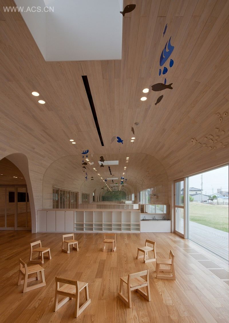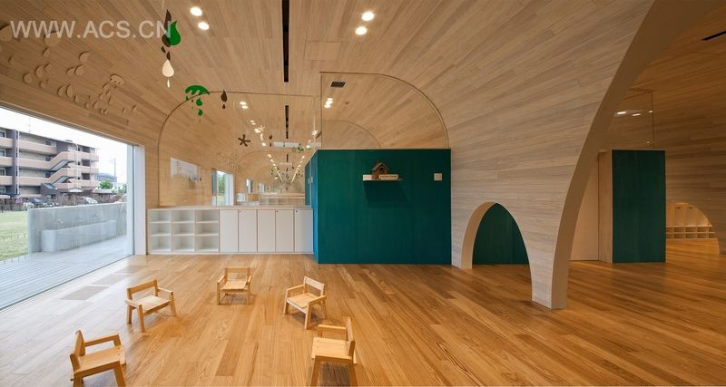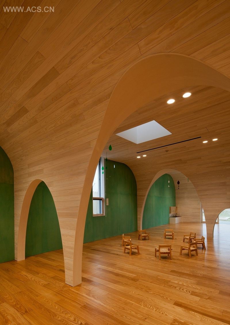 这是一所幼儿园,为零岁到五岁的140个儿童使用,位于爱知县尾张地区的旭城。在过去的许多幼儿园中,孩子们的日常活动,如玩耍、吃饭、上厕所或睡觉都在分隔开的各功能室中进行。