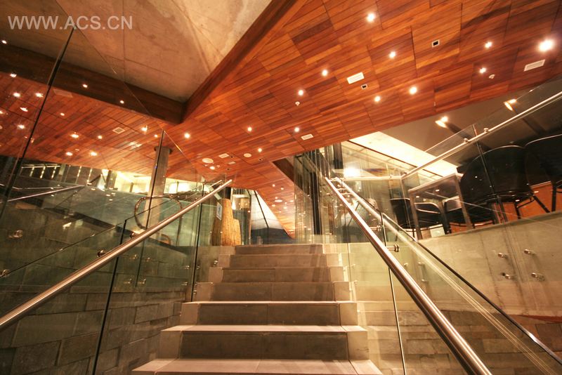 因为这些要求的影响,该建筑的设计具有2个完全相反方案。上层的设计就像是在山腰上建立了一个空间,阳台仿佛是从山腰伸出来一般,台空间。在这个层面上有游泳池,健身房和一个小食堂。