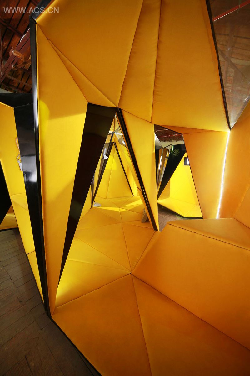 把这些模块放进一个空间结构形成它的标准形象,它们是一块块非常尖锐的几何形状,闪亮黑色外表面与柔和的黄色内表面形成鲜明对比。