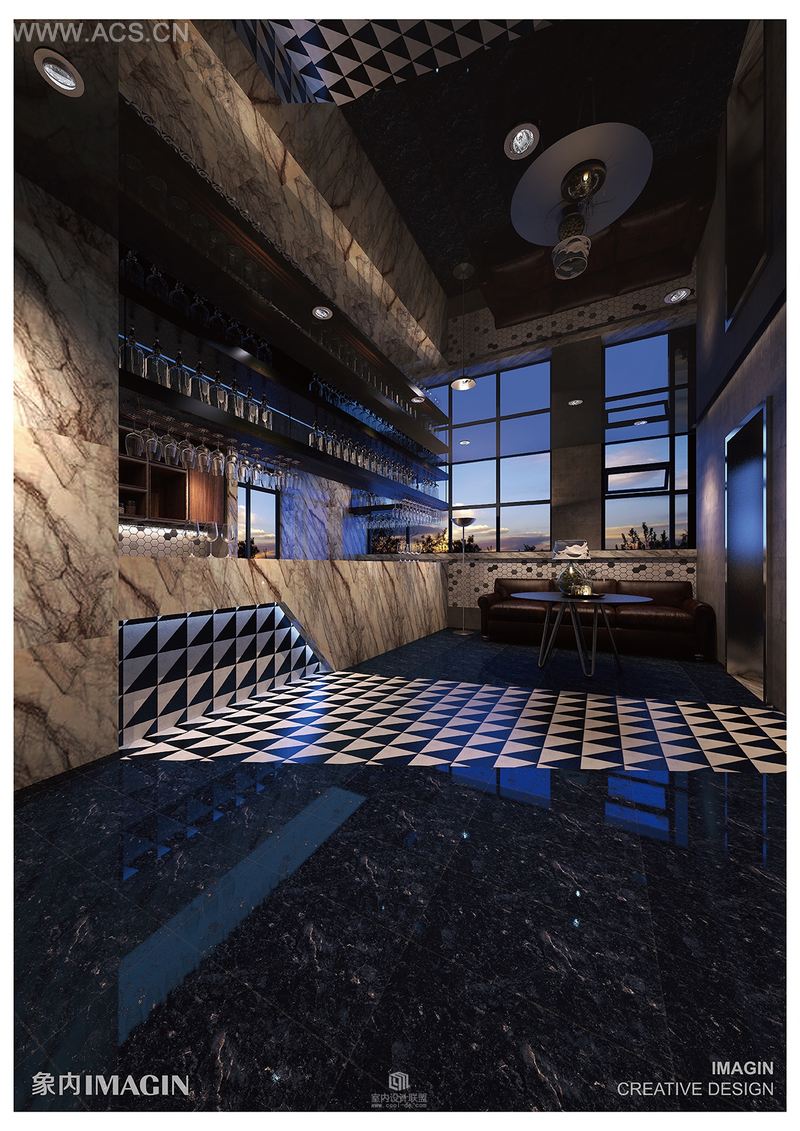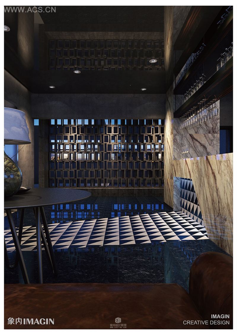 餐厅的吧台用黑白纹路相间的大理石打造而成,高贵典雅,光滑平整的台面宛若一副天然的水墨山水画。地板采用的是金网花黑色大理石,结构均匀,纹理细致,光泽柔润。黑与白的经典搭配完全不用担心会因时间的推移而过时,简约的线条具有一种直抵人心的力量,整体设计呈现时尚、简洁的气质。