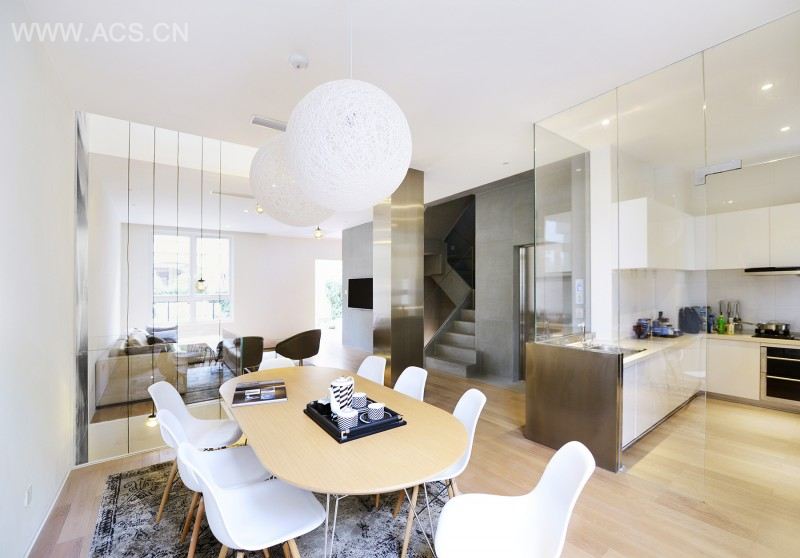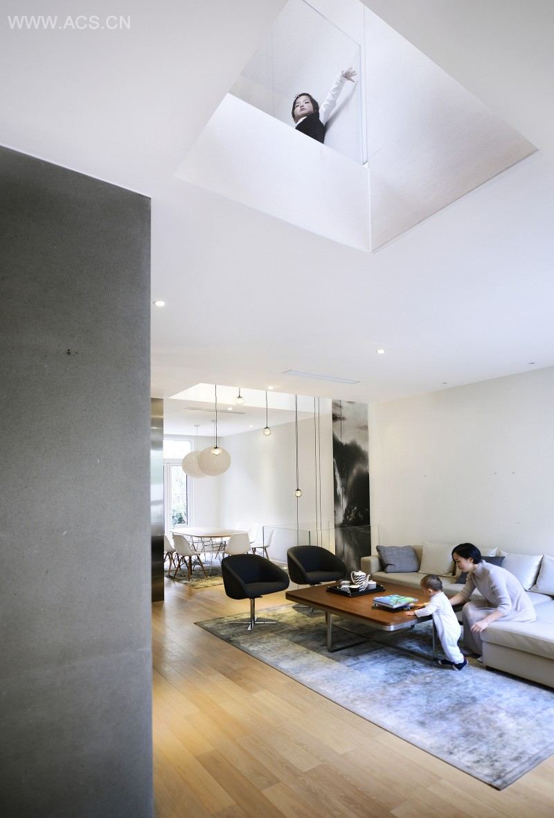 然而这个排屋设计的创新理念之处远不止如此,这个设计将Great Room理念上升了一个层次:如果有一个房子,在二层的卧室里你能看到一层的餐厅甚至是地下室的酒吧,在三层的走道上能看到一层的客厅入口,那样你才真正拥有了一个大房子!所以这个房子是一个立体化的Great Room,它通过局部掏空的楼板在视线和光线上联通了所有的楼层,为这个中间套的客户型最中心、很难采光的楼梯和走廊空间带来了光线,无论走道哪里你的视线都可以看到室外美丽的风景。为了做到这个效果,需要精心的设计让所有能够不遮挡光线地方都变得开敞通透,甚至是一个卫生间的洗手台,都以悬空的方式存在着。更重要的是无论你抬头还是低头,无论他们是在地下一层的吧台上品酒,在一层的客厅与餐厅活动、在厨房做菜,在二层的洗衣房干活、在儿童房与老人房里休息,还是在三层的走道上凭栏而靠,都可以穿越楼板看到楼上楼下、隔壁房间我们最爱的人的身影,设计让这个大房子为我们重新寻找到这个手机时代现代人缺乏相互沟通的生活中那本该拥有的真挚爱情与亲情。